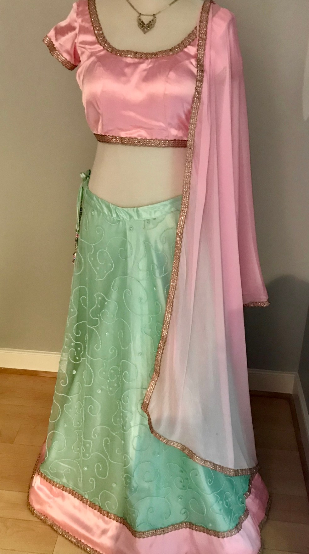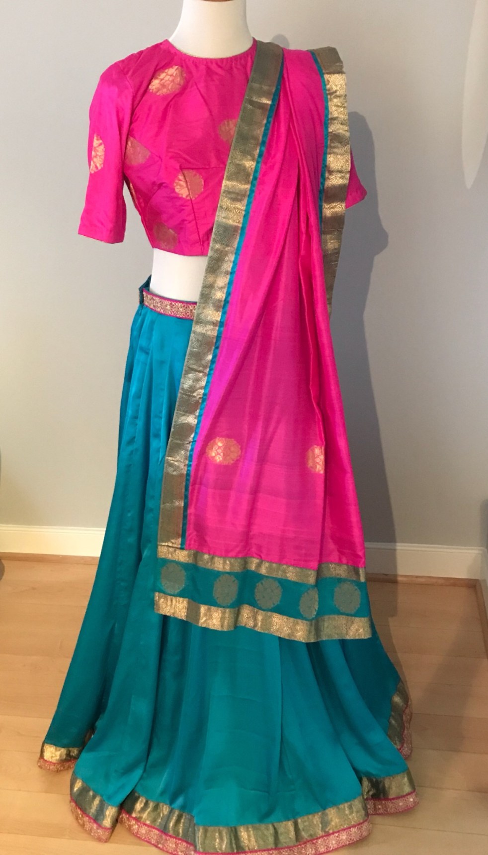 When life gives you lemons…upcycle! This project stemmed from an ironing mishap. The pallu of a South Indian silk sari was damaged beyond repair by a too-hot iron. What was left was about 5 yards of beautiful rose pink fabric that we upcycled into a high-waist lehenga. For a modern, figure-flattering look, we created a… Continue reading Sari 911 – Two lehenga looks from one damaged sari